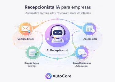 El Recepcionista IA de AutoCore actúa como un asistente digital que gestiona automáticamente las tareas más repetitivas de tu negocio.
